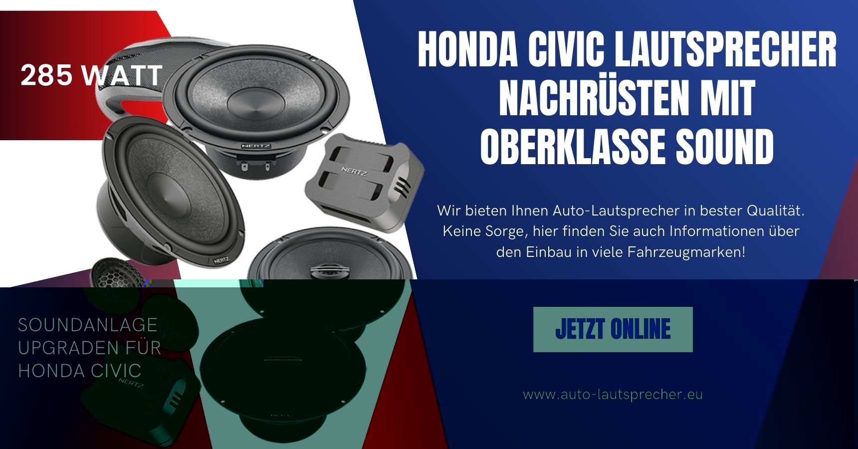 Das System besteht aus dem italienischen Hersteller Hertz CK165 2 Wege Lautsprechersystem für beide vorderen Türen mit externen Hochtönern und Frequenzweichen und dem Hertz CX 165 Koaxiallautsprecher mit internen Hochtönern für beide hinteren Türen. Die Lautsprecher des Frontsystems haben die Bewertung „sehr gut“ 2023 erhalten. Mit bis zu 285 Watt Maximalleistung und 93 DB Wirkungsgrad erzeugen sie eine hervorragende Klangqualität mit dem Radio. Damit macht Sound im Fahrzeug eine deutliche Verbesserung, für Honda Civic Lautsprecher sollte der Fahrzeughalter hochwertige Lautsprecher wählen, die auch die technischen Anforderungen erreichen.