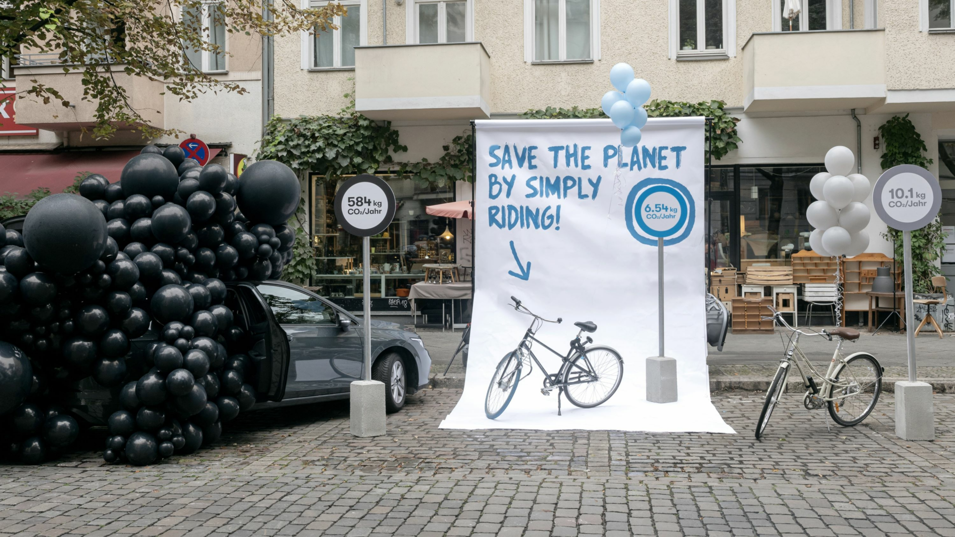 Berlin, 22.09.2023 – Der holländische Fahrrad-Abo Anbieter Swapfiets zeigt am heutigen „Autofreien Tag“ in Berlin eindrucksvoll, wie jeder Einzelne seinen ökologischen Fußabdruck verringern kann. Die Kunstinstallation „co2mparison“ in der Niederbarnimstraße veranschaulicht anhand umweltfreundlicher Luftballons, wieviel Gewicht CO2 ein PKW (584 kg), ein herkömmliches Fahrrad (10,1kg) und ein Swapfiets Deluxe 7 (6,54 kg) durchschnittlich pro Jahr inklusive Produktion und Entsorgung (bzw. Recycling) verursachen. Die klare Botschaft: Die Umweltbelastung durch Benziner ist riesig, doch mit dem Umstieg aufs Fahrrad können wir alle einen beachtlichen Teil zur Verbesserung unserer Welt beitragen. Wer das Auto stehen lässt und stattdessen Fahrrad fährt, reduziert den eigenen CO2-Ausstoß enorm. Fahrrad-Abos von Swapfiets helfen dem Klima sogar noch mehr.