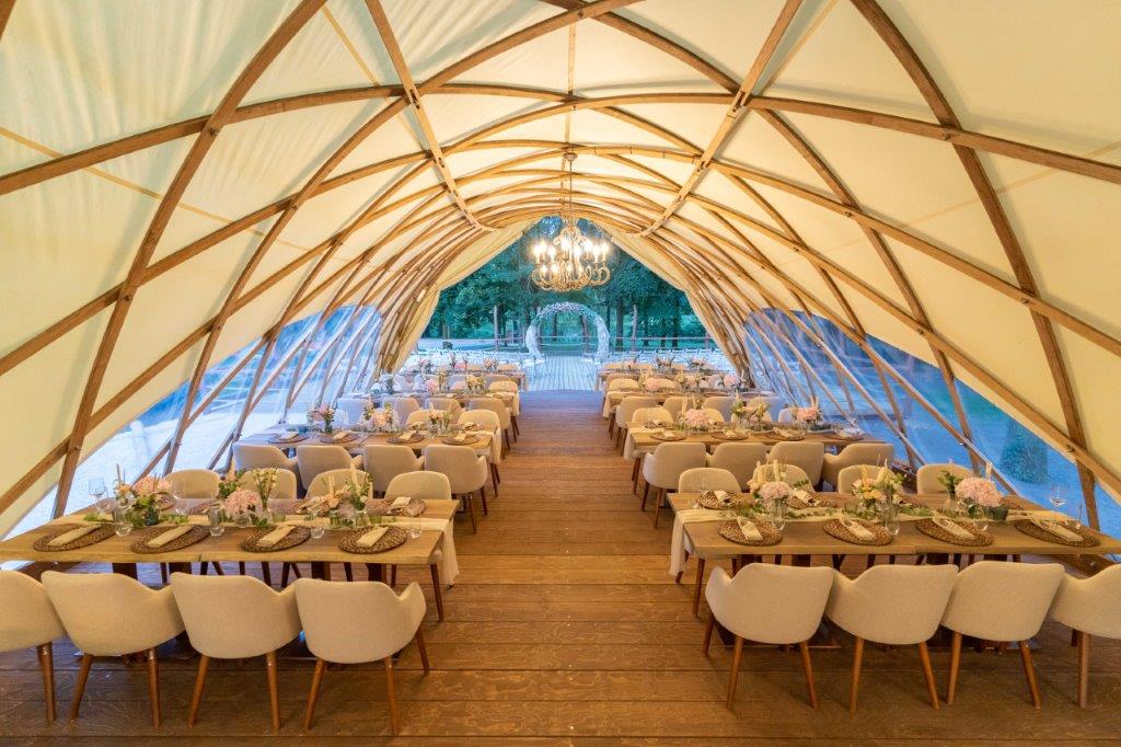 Der Event-Pavillon ist eine drei-flügelige Kreation aus natürlichen Materialien. Dabei ist er wasserfest, via Infrarot beheizbar und hält Windböen bis 140 km stand.