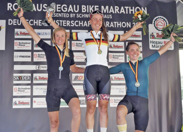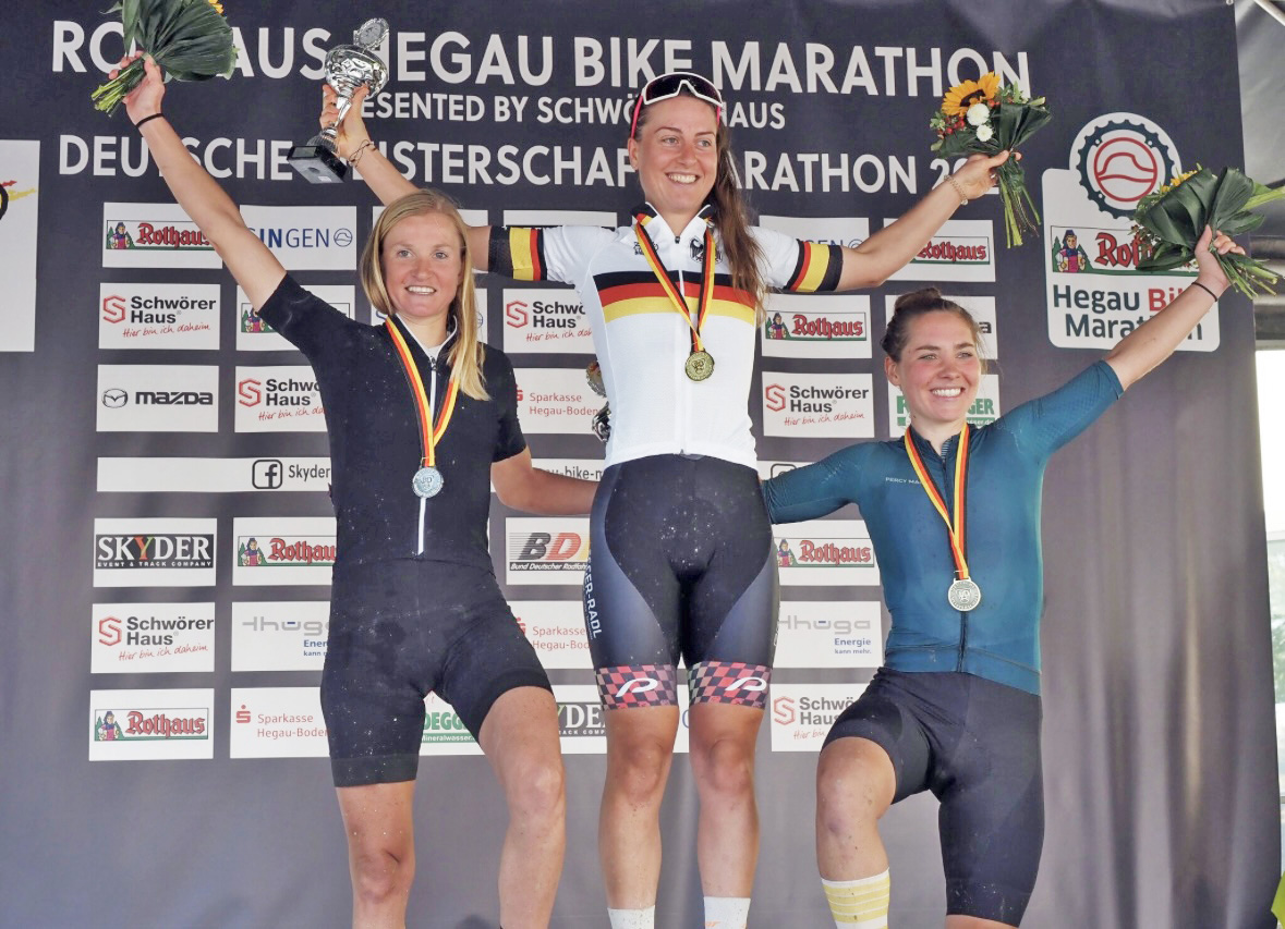 Tanja Priller vom RSC Wolfratshausen hat die Deutsche Marathon-Meisterschaft der Mountainbiker am 24. September 2023 in Singen am Hohentwiel im Hegau für sich entschieden. Mit 4 Minuten Vorsprung ließ sie ihre Verfolgerinnen Bettina Janas und Svenja Bretz auf der Strecke über 80 Kilometer und 2.000 Höhenmeter souverän hinter sich und holte sich den Meistertitel. Die Mountainbikerin aus Penzberg kann ihren Sieg noch nicht ganz fassen: „Wir sind erst eine 30 km Runde gefahren und dann nochmal eine 50 km Runde. Ich habe gewusst, dass mir die Strecke eigentlich nicht so liegt, da es leider keine langen Anstiege gab, sondern immer nur kurze, dafür sehr viele kleine Anstiege. In den letzten 3 Wochen habe ich mich mit meinem Trainer gezielt darauf vorbereitet. Die Trainings mit den kurzen harten Intervallen waren richtig hart für mich, aber es hat sich wohl gelohnt!“
