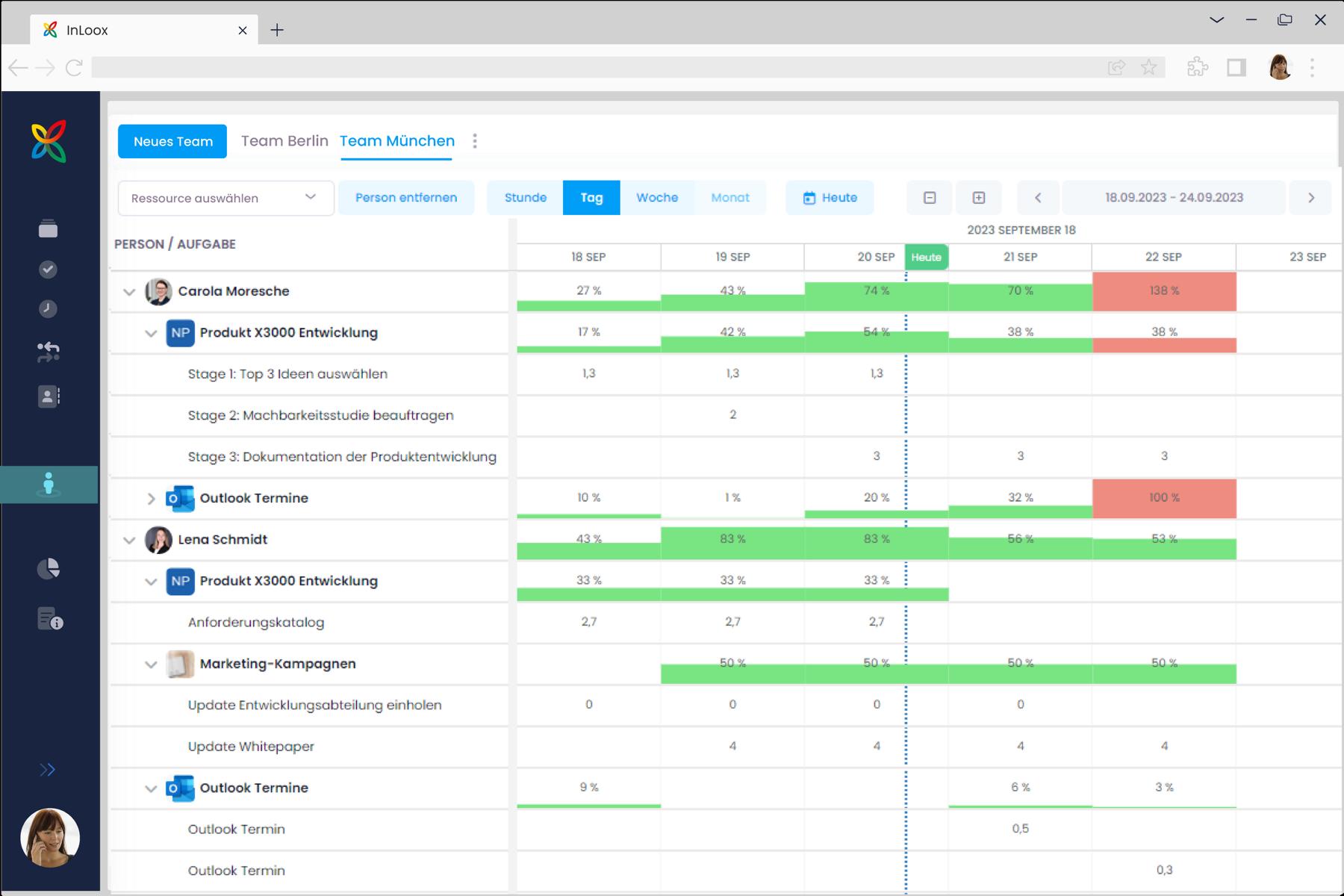 Aufgrund der verbesserten Benutzeroberfläche ist insbesondere die Ressourcenbelegung in InLoox nun komfortabler zu bedienen und lässt sich individuell einstellen. So kann die Ressourcenübersicht wahlweise in den Auflösungsstufen Stunde, Tag, Woche oder Monat angezeigt werden. Und um eine maßgeschneiderte Sicht auf die Auslastung der Teammitglieder zu erhalten, können Projektverantwortliche nun bei der Ansicht des Zeitrahmens auswählen, ob sie vordefinierte Zeitspannen oder individuell gewählte Daten aus dem Kalender verwenden wollen.