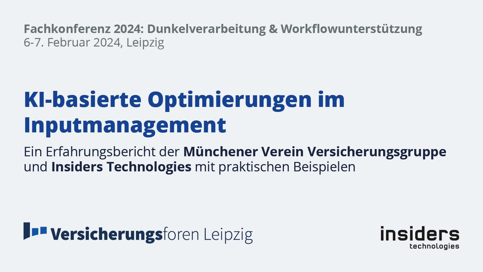 Kaiserslautern, 24. Januar 2024 – Insiders Technologies, führender Anbieter von Software für Cognitive Process Automation, stellt gemeinsam mit seinem Kunden Münchener Verein auf der Fachkonferenz „Dunkelverarbeitung & Workflowunterstützung in Versicherungen“ der Versicherungsforen Leipzig Möglichkeiten zur kontinuierlichen Optimierung des Inputmanagements durch neue Technologien der Künstlichen Intelligenz vor.