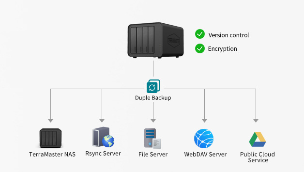 Das Zusammenwirken von TerraMaster Centralized Backup und Duple Backup erstellt eine unzerstörbare Festung in Sachen Datensicherheit für Benutzer. Mit ihren leistungsstarken Funktionen kann die „Centralized Backup“-Anwendung problemlos verschiedene Daten wie Windows-Geräte, Dateiserver und virtuelle Maschinen auf TNAS aggregieren, um eine Verwaltung und Wiederherstellung aus einer Hand zu erreichen. Die „Duple Backup“-Anwendung verstärkt diese Verteidigungslinie zusätzlich. Sie kann wichtige Daten im TNAS auf andere Speichergeräte oder die Cloud spiegeln, um die Datensicherheit in Extremsituationen zu gewährleisten. Die nahtlose Zusammenarbeit zwischen diesen beiden sorgt für einen umfassenden Datenschutz vor jeglichen Datenrisiken und gewährleistet dadurch die absolute Sicherheit und Integrität der Daten.