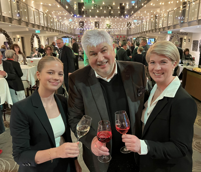 „Ein kleines persönliches Brevier in Form eines Schulheftes begleitete jeden Gast durch den Abend und erzählte Geschichten zu den Weinen und dem Menü“, erklärt Hoteldirektor Walter Sosul. „So entwickelten sich interessante Gespräche, die oft begannen mit der Frage: Erinnerst Du dich noch, das gabs doch damals auch bei uns.“ Die zur Weingala eigens angereiste Tina Pfaffmann hatte für diese inspirierende Zeitreise zahlreiche Genuss-Weine von ihrem traditionsreichen Familien-Weingut im rheinland-pfälzischen Frankweiler im Gepäck. Da die Winzerin sich auf Weißweine unterschiedlicher Prägung spezialisiert hat, brachte sie ihre Nichte Eva Fader mit. So präsentierte die erst 17-Jährige erstmals auf der Weingala in Krefeld mit großem Fachwissen den Rotwein „2021 Cuvee Triologie Noir“ vom gleichnamigen Weingut ihrer Eltern.