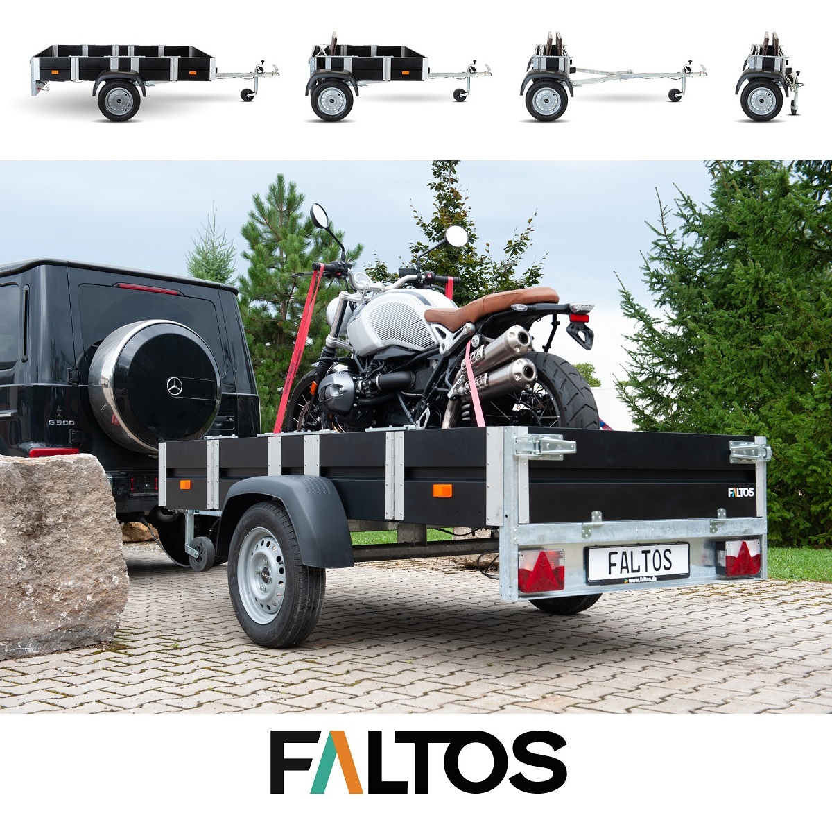 Mit seiner langen Ladefläche und einer maximalen Zuladung von 550 kg ist der FALTOS für eine Vielzahl an Transportaufgaben geeignet – z.B. für schnellere Umzüge, komfortable Zweiradtransporte und einfache Fortbringung größerer Materialmengen. Anpassbare Ablastungen, die eine Einstellung von Nutzlast und zulässiger Geschwindigkeit umsetzen, ermöglichen dabei die sichere, individuell gewünschte Transportlösung. Ergänzend sorgen integrierte Verzurrösen in den Bodenplatten für eine flexibel umsetzbare Ladungssicherung. Die Funktionalität seiner faltbaren Anhängerlösung erweitert FALTOS mit passendem Zubehör – darunter Halterungen für Motorräder und E-Bikes bis hin zu verschiedenen Planen und Ladungssicherungsnetzen.