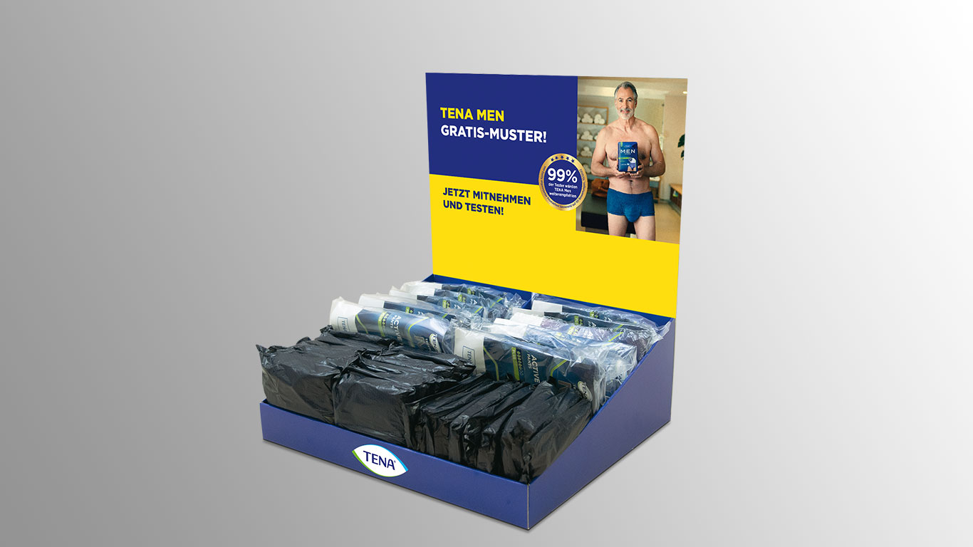 Durch ein fachkundiges Beratungsgespräch lassen sich noch mehr Kunden von den diskreten, bequemen und zuverlässigen TENA Men Produkten überzeugen – und dauerhaft an den Fachhandel binden. Zur Unterstützung bei der Beratung und Bemusterung der Männerzielgruppe stehen eine bestückte TENA Men Gratis-Musterbox und Endverbraucherbroschüren in einem praktischen Dispenser zur Verfügung. Die kostenlosen POS-Materialien können auf Wunsch gleich mit dazu bestellt werden.