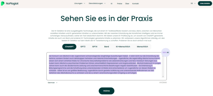 Das Tool verfügt über eine einfach zu verwendende und intuitive Benutzeroberfläche und liefert eindeutige Ergebnisse: Nachdem Nutzer:innen den zu prüfenden Text in die Benutzeroberfläche eingegeben oder in Dokumentform hochgeladen haben (bis zu einer Million Zeichen sind gleichzeitig möglich), analysiert NoPlagiat den Text auf Basis morphologischer Sprachinformationen. Potenziell KI-generierter Text wird dann farblich hervorgehoben. Je heller die Farbe, desto größer ist die Wahrscheinlichkeit, dass eine Textstelle KI-generiert ist. Dabei gilt die Faustregel: Stellt das Tool eine Wahrscheinlichkeit von mehr als 50 Prozent fest, ist davon auszugehen, dass der Text KI-generiert ist.
