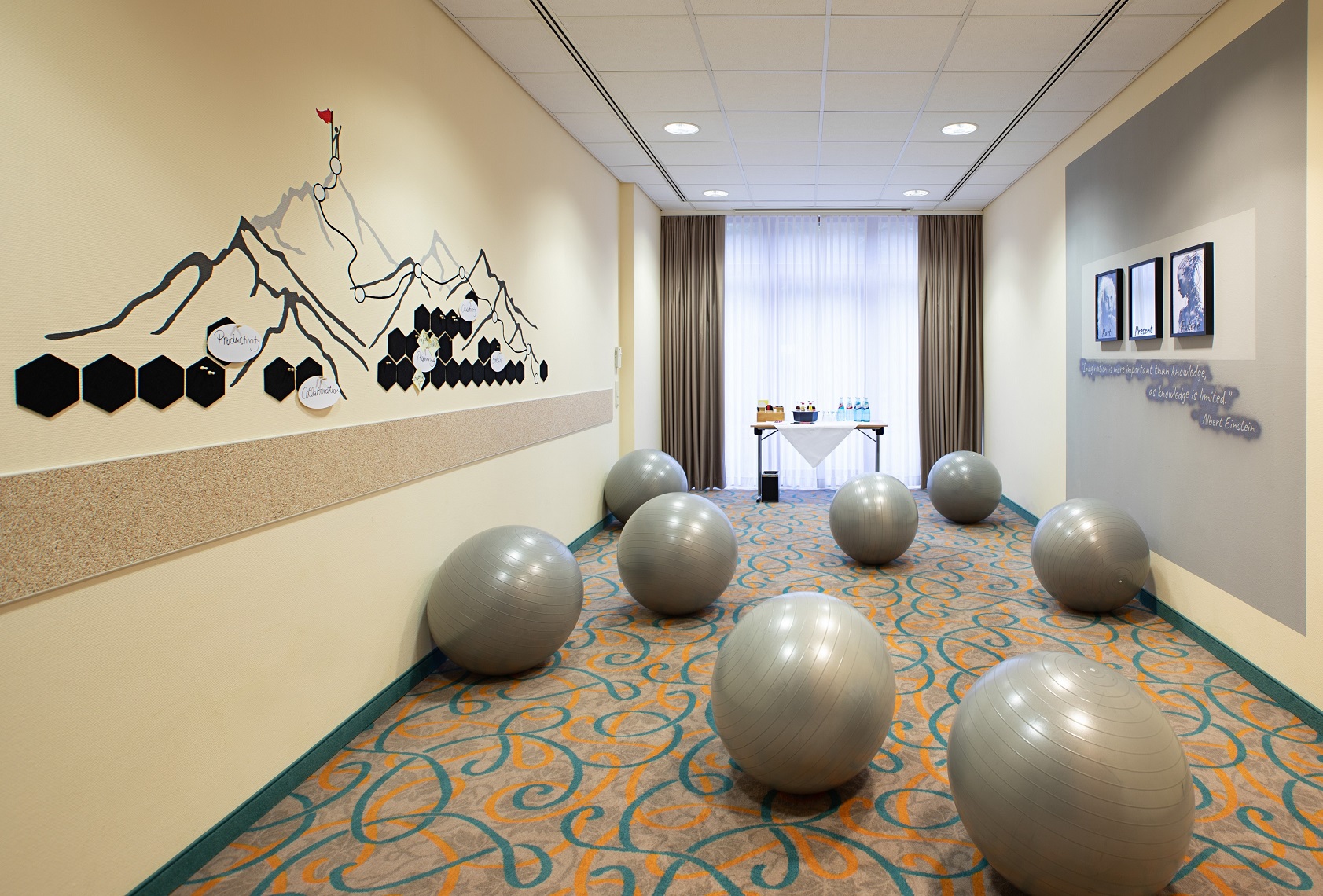 „Fantasie ist wichtiger als Wissen, denn Wissen ist begrenzt“, diese berühmten Worte Albert Einsteins verzieren als Graffiti die Wand. Der ihm gewidmete Raum „MeilEINSTEIN“ steht ganz im Zeichen von Entwicklung und Errungenschaften – als Inspiration für Business-Gäste. Denn gerade Fantasie und Kreativität sind essenziell, wenn es um Innovationen, neue Ideen, Produkte und Konzepte geht. Ein weiteres zentrales Element: Eine Berglandschaft mit aufgezeichneter Wanderroute, Etappenzielen und Gipfelstürmern. Die darin integrierten Wandkacheln aus Filz können mit Keywords auf Karteikarten bestückt werden. Der hell gestaltete Raum eignet sich bestens, um im Team an der Visualisierung von Visionen, an Wegen und Zielen zu arbeiten. Eine klassische Bestuhlung gibt es nicht. Stattdessen sitzen die Gäste auf Gymnastikbällen und bleiben so ständig in Bewegung. Diese körperliche Aktivität regt die Gedanken an und fördert Aufmerksamkeit sowie Engagement.