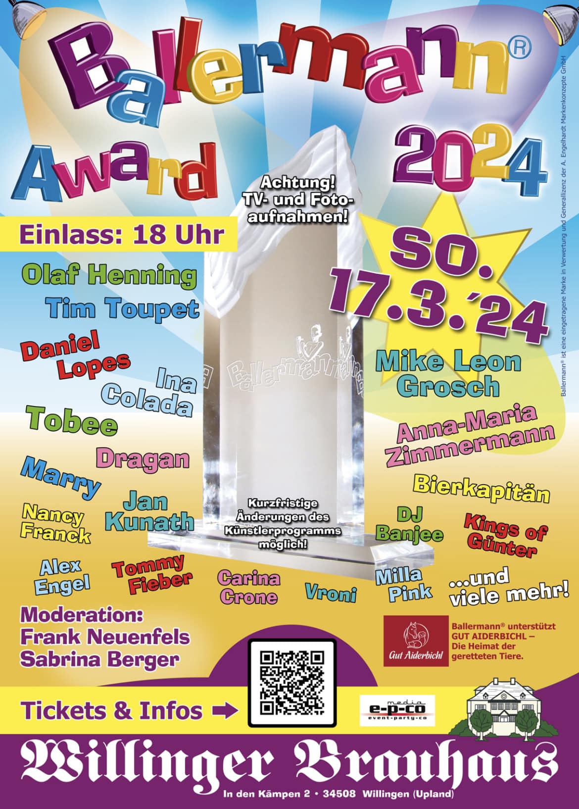 Die Vorbereitungen der Verleihung des wohl bedeutendsten und begehrtesten Künstlerpreises der Party- & Eventszene, des BALLERMANN AWARD, gehen in den Endspurt. Bereits zum 16. Mal werden am 17. März 2024 Künstler aus der deutschen Partyszene für herausragende Leistungen in 2023/24 mit der begehrten Auszeichnung unter der Lizenzmarke Ballermann, geehrt.