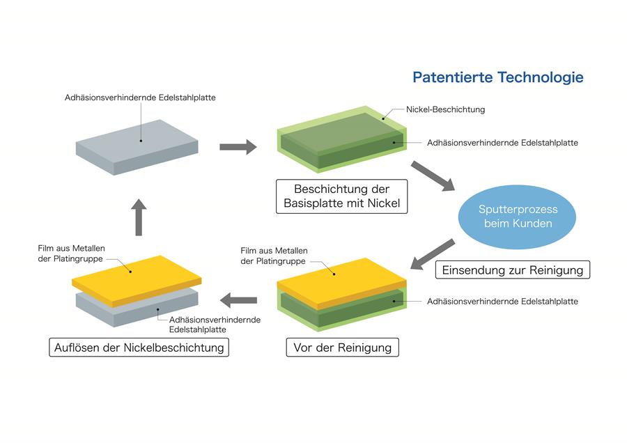 TANAKA Green Shield vermeidet diese Nachteile durch einen patentierten Prozess. Dabei wird auf die adhäsionsverhindernde Basisplatte eine Nickelschicht aufgebracht. Der Kunde bringt wie gewohnt mit Vakuumdeposition oder Sputtern Metalle der Platingruppe auf (Platin, Palladium, Rhodium, Ruthenium, Iridium, Osmium). Danach wird die Nickelschicht zwischen der adhäsionsverhindernden Platte und der gesputterten Schicht chemisch aufgelöst. Dadurch können nicht nur die gesputterte Schicht mit den Edelmetallen, sondern auch andere aufgeklebte Schichten mit unterschiedlichen Zusammensetzungen von der Platte abgelöst werden, ohne das Basismaterial zu beschädigen. Das Verfahren eignet sich für eine große Vielfalt unterschiedlich geformter Bauteile. Die Reinigungsmethode verhindert nicht nur eine Beschädigung des Basismaterials, sie ist auch kostengünstiger als etwa die Aluminiumbeschichtung. Außerdem werden geringere Mengen an Reinigungsmitteln benötigt, was es zu einer umweltfreundlichen Reinigungsmethode der nächsten Generation macht.
