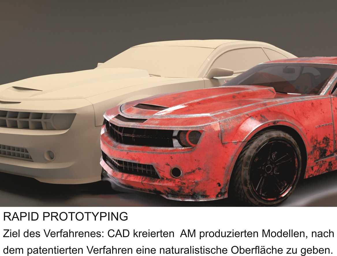 Das Verfahren ermöglicht es, allen 3D Körpern, die mit 3D-Druckern hergestellt wurden, aber natürlich auch CNC/LASER erstellten 3D-Objekten nachträglich eine fotorealistische Oberfläche zu geben (sie 3d-farbig zu beschichten). Wir schaffen keine neuen Körper, sondern beschichten bereits bestehende.