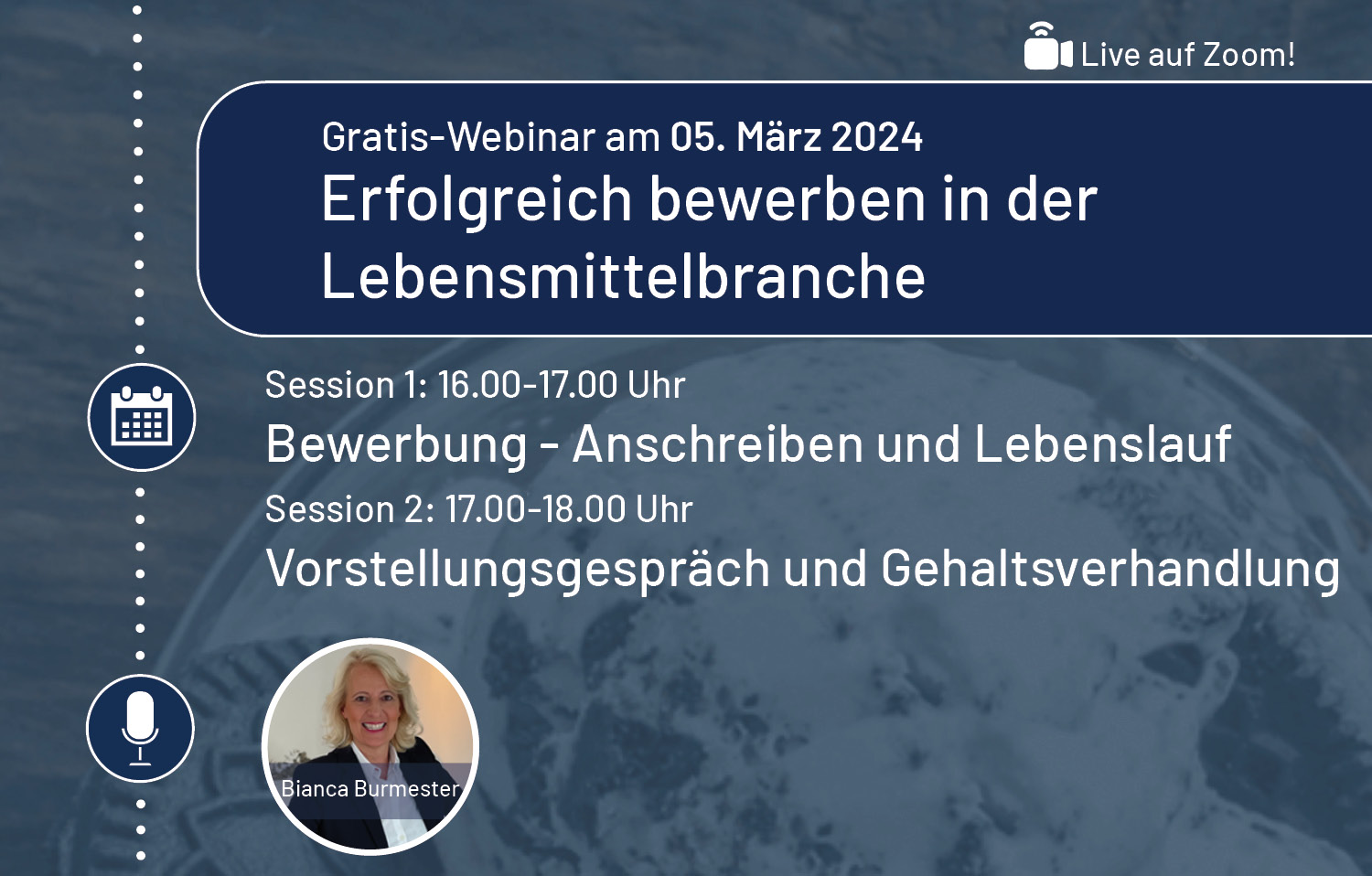 Gehostet wird das Webinar von der foodjobs.de-Geschäftsführerin Bianca Burmester. Sie ist Expertin in Sachen Online-Recruiting sowie Bewerbungen in der Lebensmittelbranche. Mit ihren Bewerbungstrainings, die sie normalerweise exklusiv für Hochschulen, Universitäten oder Verbände hält, hilft sie Kandidat:innen mit nützlichen Tipps und Tricks. Hierbei lernen Bewerber:innen, sich professionell zu verkaufen und Selbstbewusstsein für den Bewerbungsprozess zu tanken, um so ihren Traumjob zu finden.