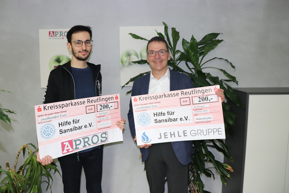 Wolfschlugen/Reutlingen. Zusammen für Sansibar – Für die gute Sache kooperieren und engagieren sich Auszubildende der Jehle-Gruppe aus Wolfschlugen und der APROS Consulting und Services aus Eningen. Erneut wurde die langjährige Kooperation zwischen den beiden Unternehmen im Ausbildungsbereich ausgebaut. Während eines gemeinsamen Projektes, überreichten die Auszubildenden eine Spende in Höhe von Euro 400 an den Verein „Hilfe für Sansibar e.V.“.
