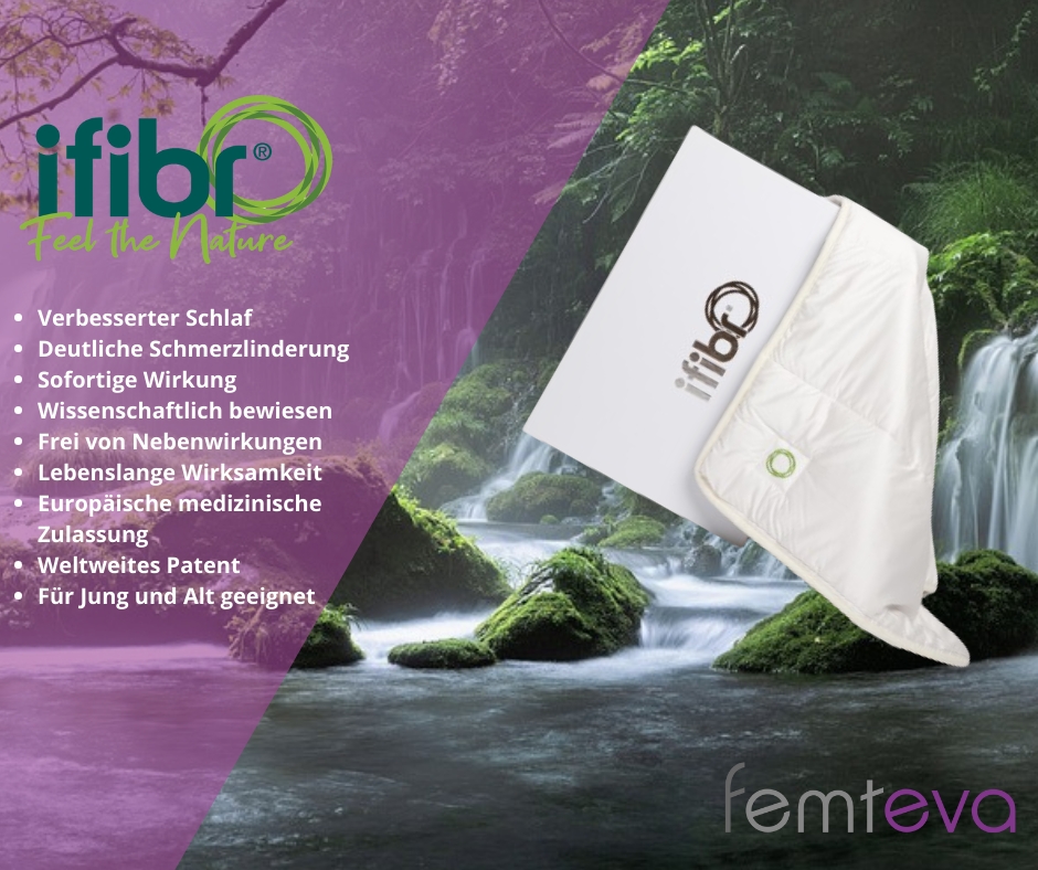 Die Basis der ifibr® Siliziumauflage der femteva UG bildet die Hightech-Faser Fibrilium®. Diese wird in einem patentierten nanotechnologischen Verfahren aus südkoreanischer Heilerde hergestellt. Fibrilium® hat die einzigartige Fähigkeit, die natürliche Zellstrahlung des Körpers zu reflektieren und zu verstärken. In Kombination mit ebenfalls enthaltenen Mineralstoffen kann ifibr® einen positiven Einfluss auf das Schlafverhalten, die Zellregeneration, die Durchblutung und die Entspannung des Körpers haben.