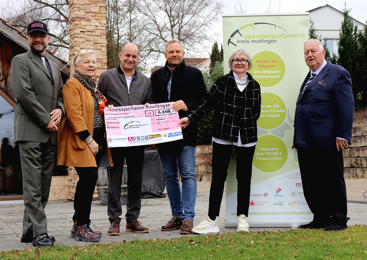 Das Reutlinger Spendenparlament freut sich über die großzügige Spende in Höhe von 6600 Euro. Gemeinsam von Firmen-Mitgliedern des Mentorenkreises, der APROS Consulting & Services GmbH, der Villforth Siebdrucktechnik GmbH, Landgraf Ihr Immobilienmakler und DVAG Direktion Jörg Wahlert wurde der Scheck an die Verantwortlichen des Spendenparlaments überreicht.
