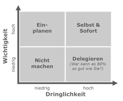 Ein weiteres erfolgsversprechendes Tool, durch das Führungskraft effektives Zeitmanagement erlernen, ist die Eisenhower-Matrix. Drath erläutert: „Dieses Hilfsmittel ist einerseits leicht verständlich und stellt andererseits eine effektive Struktur dar, um den allgegenwärtigen Wust an Aufgaben zu bewältigen. Es ist erstaunlich, wie viele Führungskräfte heute solche oder ähnliche Modelle zwar kennen, aber nicht beherzigen.“ Diese Methode wurde ursprünglich vom US-amerikanischen General und Präsidenten Dwight D. Eisenhower entwickelt. Indem sie zwischen Dringlichkeit und Wichtigkeit differenziert, hilft sie vor allem unter Zeitdruck, die knappe Zeit sinnvoller zu verteilen.
