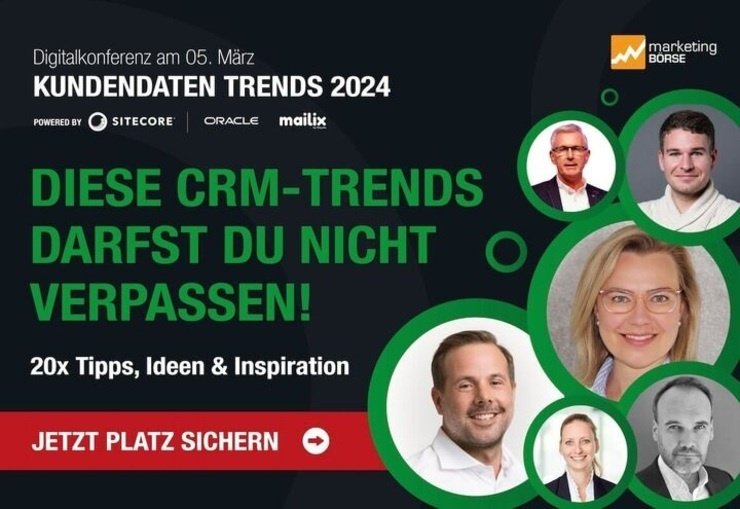 Die Konferenz „Kundendaten Trends 2024“ versammelt am 5. März 2024 führende Experten aus der Marketingbranche, um die neuesten Trends und Technologien im Bereich der Kundendaten zu diskutieren. Unter anderem mit dabei Christian Bachem, Steven Burkhardt, Jenny Gruner, Thomas Koch, Frank Puscher, Björn Radde, Ralf Scharnhorst und Markus Wuebben.