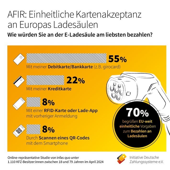 Zum 13. April 2024 ist die Verordnung über den Aufbau der Infrastruktur für alternative Kraftstoffe (Alternative Fuels Infrastructure Regulation, AFIR) in der gesamten EU in Kraft getreten – und mit ihr die Verpflichtung für Ladesäulenbetreiber, bei neu aufgestellten Schnellladesäulen die Kartenzahlung über ein Terminal zu ermöglichen. Dass die Europäische Union mit der neuen Regulierung dem Wunsch der Verbraucher:innen nachkommt, zeigt eine aktuelle online-repräsentative Umfrage von infas quo im Auftrag der Initiative Deutsche Zahlungssysteme. 76,7 Prozent der Befragten bevorzugen es, den getankten Strom an der Ladesäule mit ihrer Debit- oder Kreditkarte zu bezahlen. Die Mehrheit (54,5 Prozent) würde sogar lieber mit ihrer gängigen Debitkarte, wie etwa der girocard, zahlen.