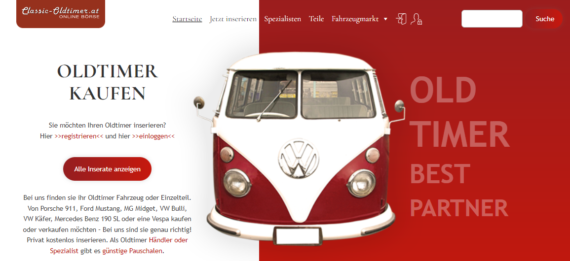 Classic Oldtimer ist Österreichs erste Online-Börse für Oldtimer-Fahrzeuge und bietet eine umfassende Plattform für Oldtimer-Liebhaber. Die Website ermöglicht den unkomplizierten Kauf und Verkauf von Klassikern und Ersatzteilen, darunter renommierte Marken wie Porsche, Ford Mustang und VW Käfer. Als eine der größten Online-Börsen im deutschsprachigen Raum können Privatpersonen hier kostenlos Inserate erstellen und gezielt nach speziellen Fahrzeugen oder Einzelteilen suchen.