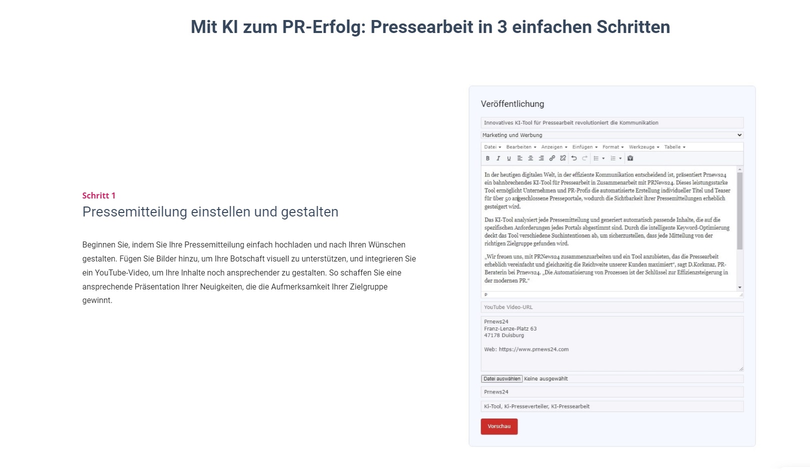 - SEO-Optimierung für jedes Presseportal: Die Inhalte werden nicht nur veröffentlicht, sondern gezielt SEO-optimiert, sodass sie sowohl kurzfristig als auch langfristig eine bessere Platzierung in den Suchergebnissen erzielen.